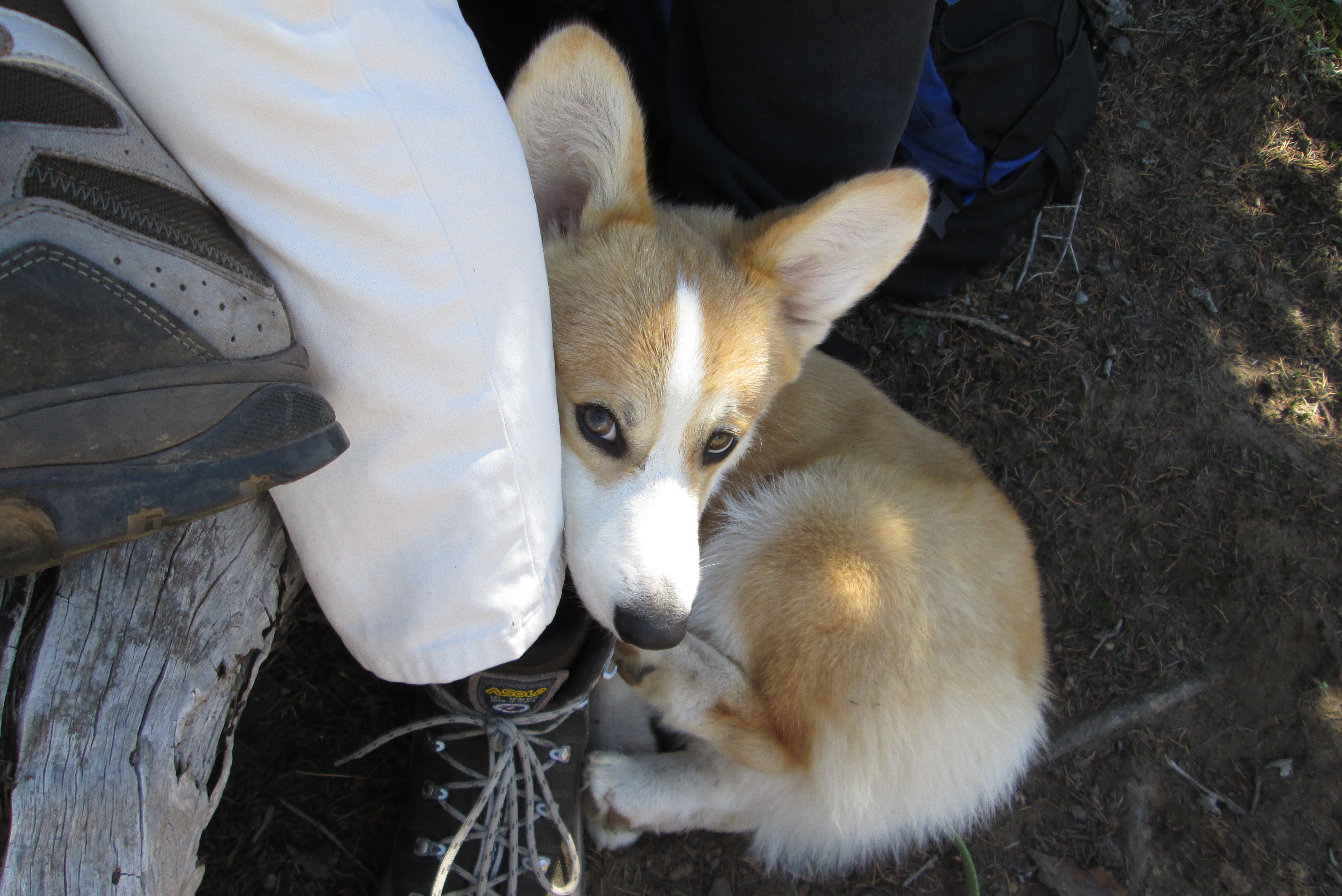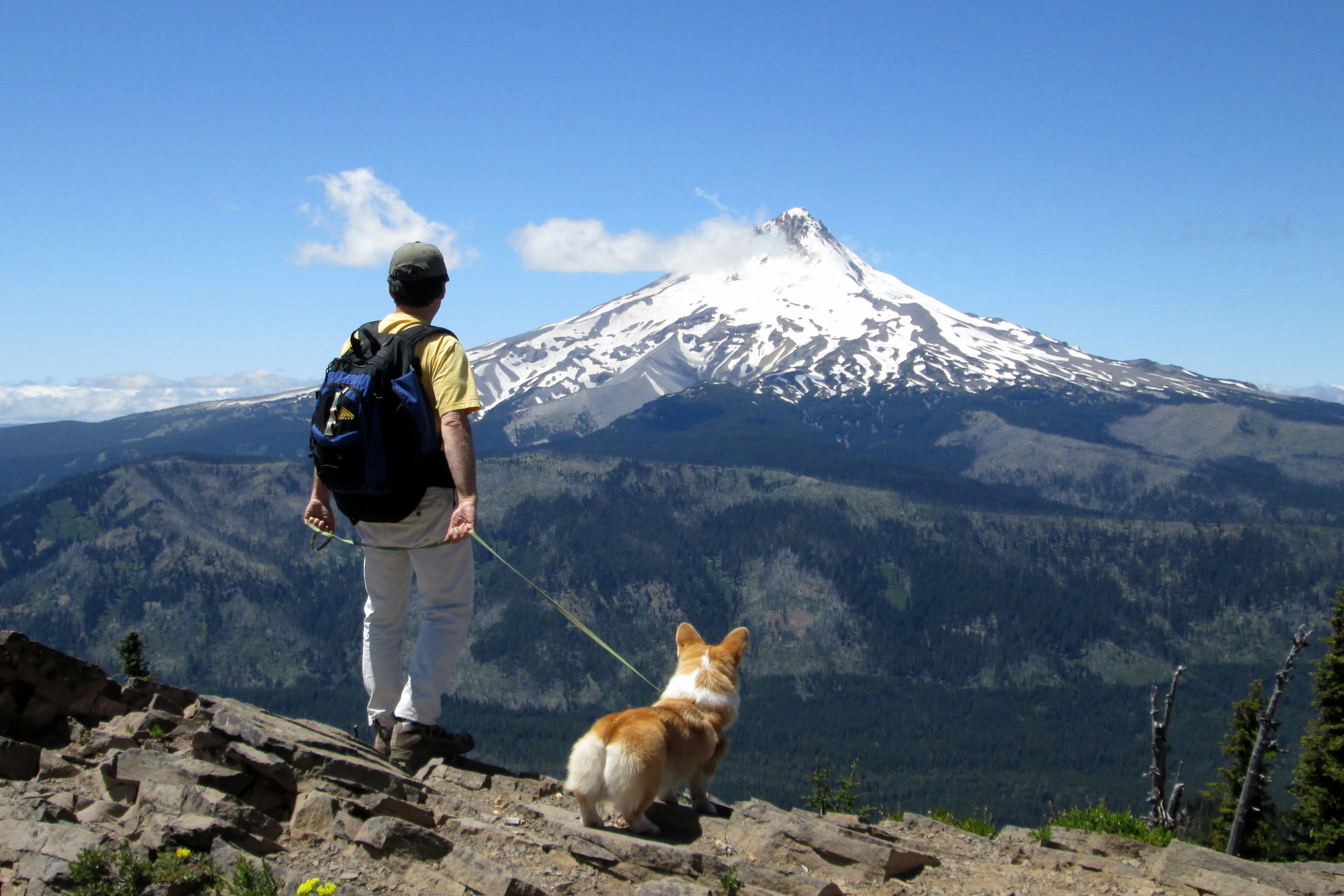 Lucky enjoyed being out in the wild. You’d think he was an animal or something. At midday we rested in the shade, with a view of Mount Jefferson to the south and Hood to the west. To the north was Adams and, breaching a stream of clouds like a dolphin, the snowy fin of Rainier.
