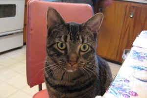 Miss Ellie is eight months old. She has a tail wide enough to wash a car. She likes food, greeting people, and watching Dad. If you’re outside the house and she’s lounging in a windowsill, she looks like a visit from a skunk. The two of them seem well-suited, napping, noshing, and watching Animal Planet.