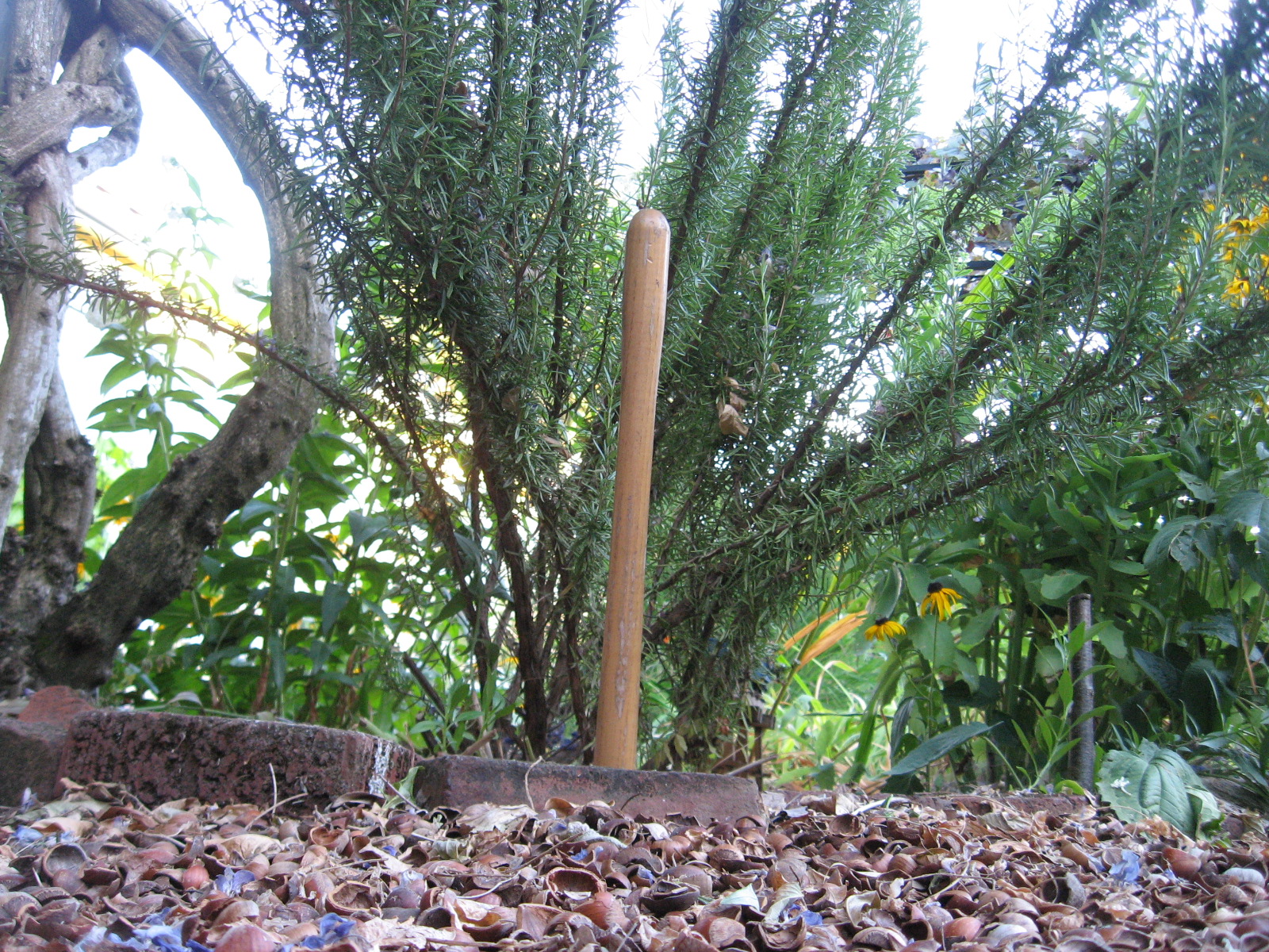 The result is a stake that’s just over a yard long (one full meter to the Russian Federation reader who visited this blog today). Use a heavy hammer to bury it about halfway. Here’s a stake I made earlier this summer: